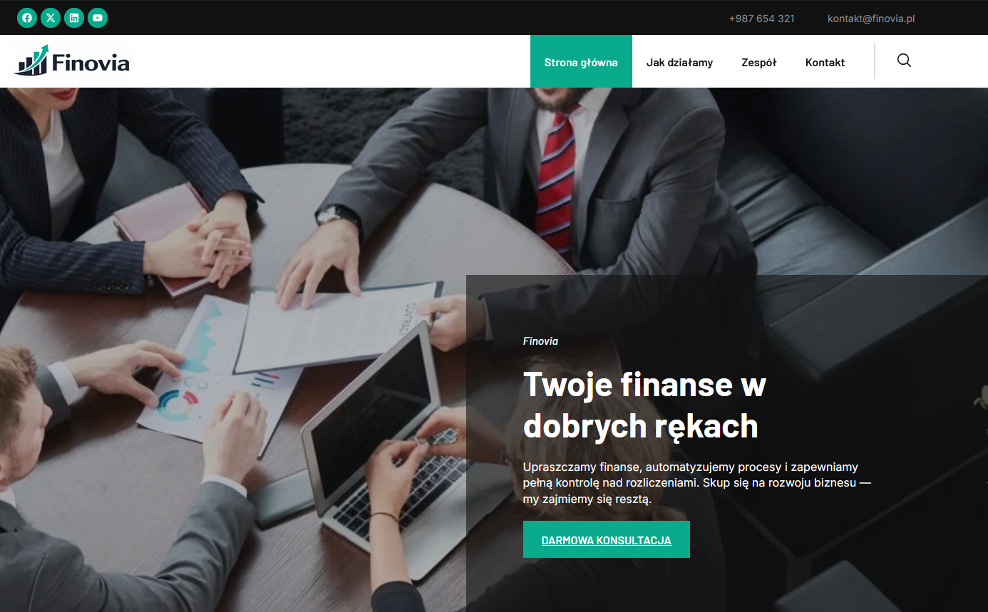 Dynamiczna i profesjonalna strona dla nowoczesnego biura rachunkowego, łącząca ekspercki wizerunek z czytelną strukturą usług.